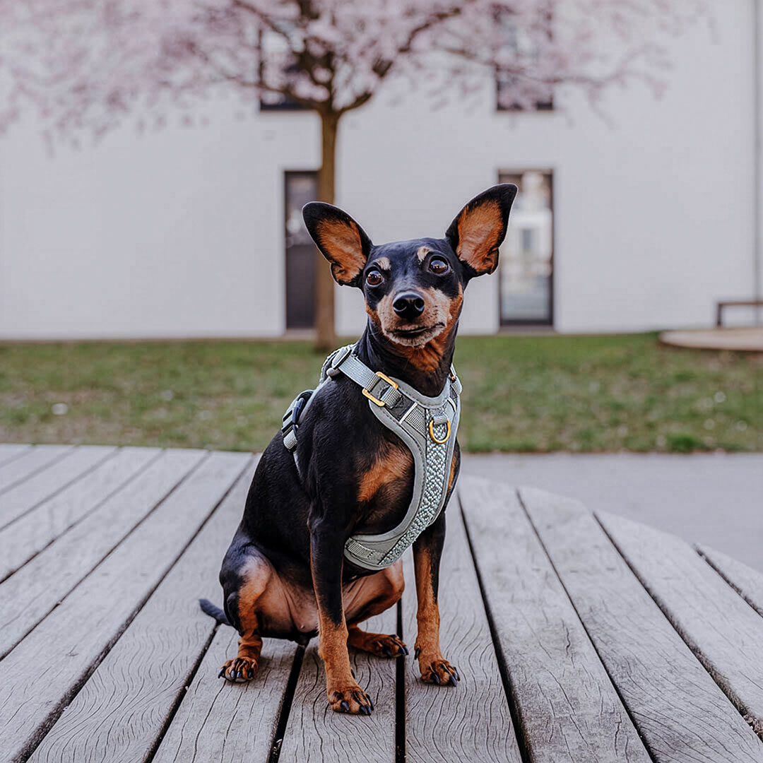 Soft neoprene combined with breathable mesh material ensures comfortable padding and an airy feel – even on longer walks. The harness is equipped with a practical handle on the back for more control in everyday life.