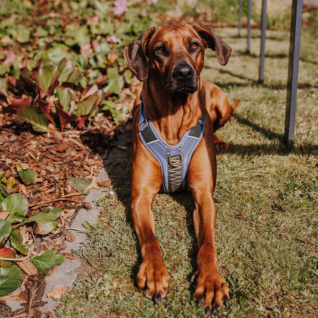 Soft neoprene combined with breathable mesh material ensures comfortable padding and an airy feel – even on longer walks. The harness is equipped with a practical handle on the back for more control in everyday life.